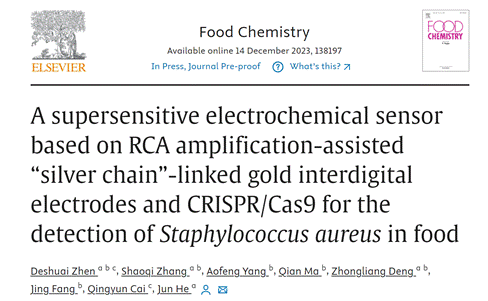 近日,南华大学甄德帅教授课题组在食品化学领域TOP期刊 Food Chemistry (IF=8.8,中科院一区,TOP期刊)杂志上发表了题为“A supersensitive electrochemical sensor based on RCA amplification-assisted ‘silver chain’-linked gold interdigital electrodes and CRISPR/Cas9 for the detection of Staphylococcus aureus in food”的学术论文,这是课题组近期在食品微生物传感领域取得的阶段性研究成果。甄德帅教授为第一作者,何军副教授为通讯作者,南华大学为第一单位和通讯单位。