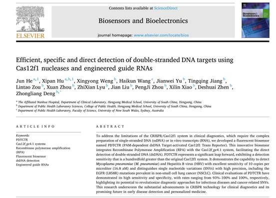 原文信息:He J, Hu X, Weng X, Wang H, Yu J, Jiang T, Zou L, Zhou X, Lyu Z, Liu J, Zhou P, Xiao X, Zhen D, Deng Z. Efficient, specific and direct detection of double-stranded DNA targets using Cas12f1 nucleases and engineered guide RNAs. Biosens Bioelectron. 2024 May 24;260:116428.