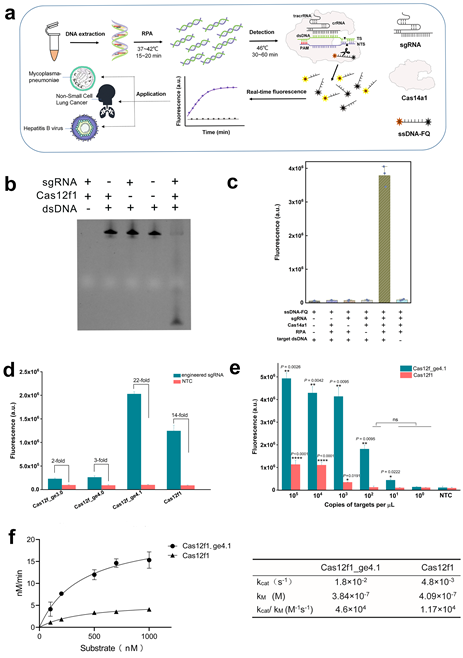 2018年,发现一种新的CRISPR/Cas14a1系统(也称Un1Cas12f1),蛋白分子量小,且对单链DNA的单碱基分辨率较Cas12a更好,能用于单链DNA和RNA检测,但制备单链DNA和体外转录操作复杂,限制了在临床进一步应用。为克服上述挑战,本课题组筛选到最佳的CRISPR/Cas12f1_ge4.1工程化系统,并结合RPA(Recombinase Polymerase Amplification)等温扩增技术,建立一种新型CRISPR荧光传感平台-PDTCTR (PAM-dependent dsDNA Target-activated Cas12f1 Trans Reporter),能在50分钟内快速和灵敏检测肺炎支原体和乙肝病毒,最低检出限为10 copies/μL,较野生型系统灵敏度提高100倍。此外新型的PDTCTR系统具有良好的单碱基区分能力,单碱基分辨的特异性优于Cas12a,能精准鉴别非小细胞肺癌EGFR (L858R)点突变,通过对临床样品进行性能评估,该系统与定量PCR相比有较高敏感度和特异度,分别为93%–100%和100%,凸显其在传染病和癌症相关SNVs诊断方面具有较大应用潜力。总之,PDTCTR系统为分子诊断提供了快速、高效和特异的检测工具,为传染病病原体和肿瘤癌基因相关的SNV精准检测提供新的检测手段和思路。