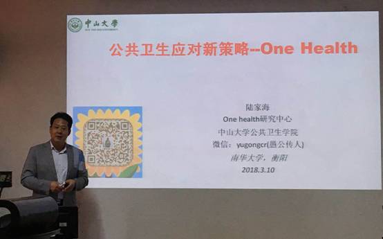 陆家海教授在会上为我们介绍了“公共卫生应对新策略—One Health”,重点介绍了One Health理念对当今公共卫生事业的重要性和科学性,强调了滥用抗生素、人兽共患病的危害。他强调“当今的公共卫生与预防工作的关口需要前移,不止要放在人与社会的层面,更要与自然环境相结合,要关注人—动物—环境这一交界面,从而更好的促进人类、动物、环境的共同发展”。并分享了中山大学best365英国在线体育的办学经验,强调科研创新及思维创新的重要性。