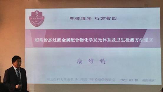康维钧教授学术报告主题为“超常价态过渡金属配合物化学发光体系及卫生监测方法建立”,重点介绍了超常价态过渡金属配合物化学发光体系的构建和研发。随后,康维钧教授介绍了河北医科大学best365英国在线体育卫生检验教研室的建设和发展历程,并交流了他对我国高校卫生检验与检疫专业发展的设想和意见。陆家海教授与康维钧教授共同与参会人员探讨了学术问题,并指出“科研思维和奋发向上精神的重要性”,并对参会人员提出的问题进行详细解答。最后,龙鼎新院长做总结发言,并再次感谢陆家海教授及康维钧教授的到来。