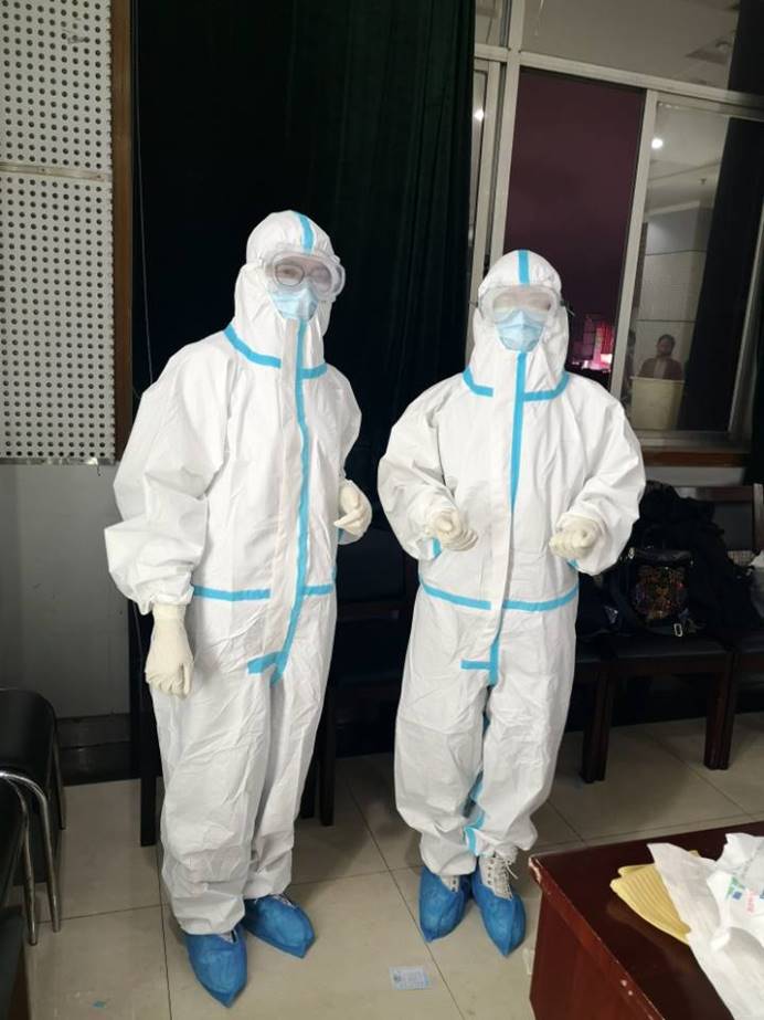 周筱艳、李良老师练习穿防护服