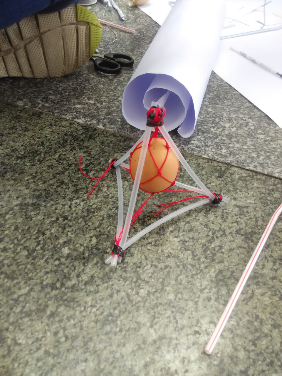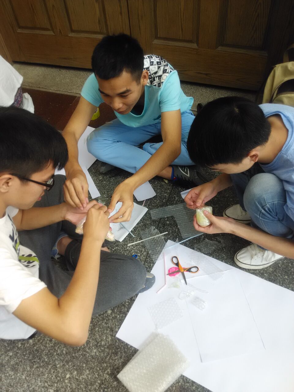 比赛要求在各种外包装的保护下,用科学的方法将一枚通过用自制装置保护后的生鸡蛋从二楼高空下落,既不破坏又准确落地,且装置越轻越好。参赛选手们发挥自己的想象力,现场制作各种保护装置,有的缓冲装置呈支架状,也有选手制造降落伞让鸡蛋缓缓下落 ,更有选手巧妙的利用气球使鸡蛋安稳落地。鸡蛋下落的时刻参赛者最紧张,现场啦啦队欢呼声更是激动人心,历时近两个多小时,鸡蛋撞地球活动顺利结束。据悉,从二楼下落的二十个鸡蛋有一半多完好无缺,比赛最后由李诗琴组智夺桂冠,周柳红组的“彩虹的后裔蛋”荣获第二名,谢臻林组荣获第三名。