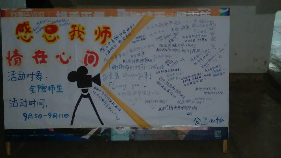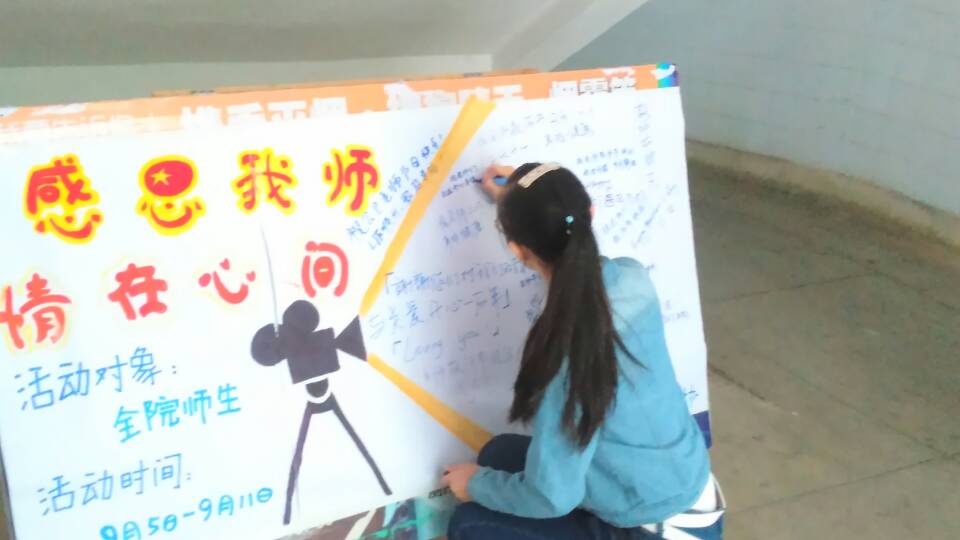 此次活动以“感恩”为主旨,围绕“送祝福、送心意、送温暖”这三个中心来开展。学院各个班级的同学在明信片上书写给老师的心里话或感恩话语,表达出自己内心最真诚的祝福;于此同时,各班组成志愿者爱心队伍,准备了一些小礼物,为老师们送上自己的心意,比如同学们亲手折的星星、模型等等,让老师们倍感温馨。然后,各班心理委员宣传动员同学们于教师节当天前往公卫楼祝福墙处填写对老师的感恩话语与祝福。