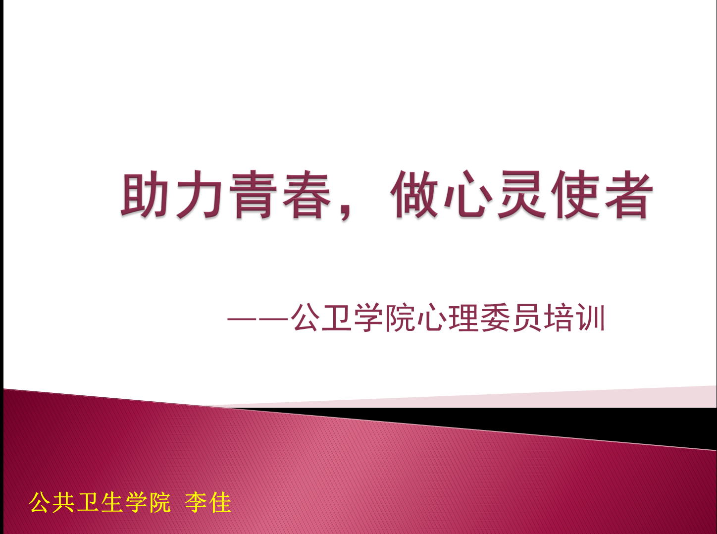 会议开始,李佳老师便微笑着跟全场朋辈辅导员们进行角色定位,表达出心理培训的重要性。接着,在“助力青春,做心灵使者”环节中,她耐心而亲切地向我们指出大学生常见的5类心理问题并就其每一类提出相应策略,让大家更清楚地明白各类心理问题的发生及解决方法。而在“交往·互助·成长”内容中,李佳老师还向大家介绍了朋辈辅导的5种基本技巧以及朋辈辅导员所要经历的5个阶段——积极倾听,设身处地,敏锐思考,准确回答,引发领悟,让我们朋辈辅导员们更加清楚了自己的职责之所在。