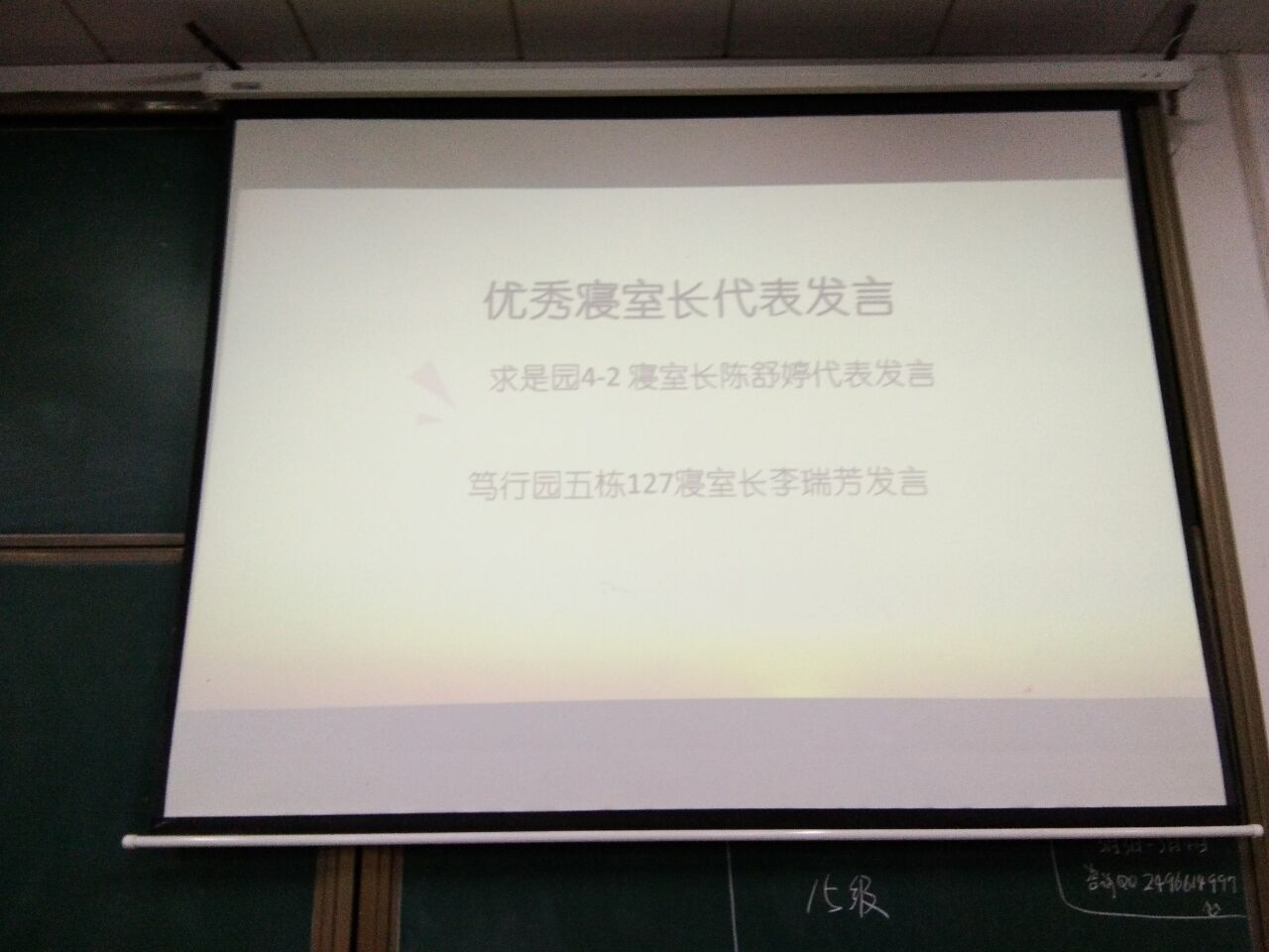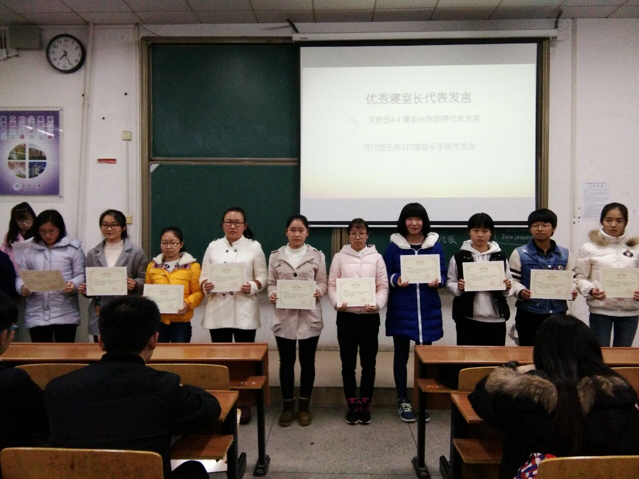 通过此次的表彰大会,一方面可以让我院寝室长意识到营造良好和谐舒适寝室的重要性,另一方面,也激励着我院学生在学习上更加努力、用心,从容不迫的面对将来学习的挑战!
