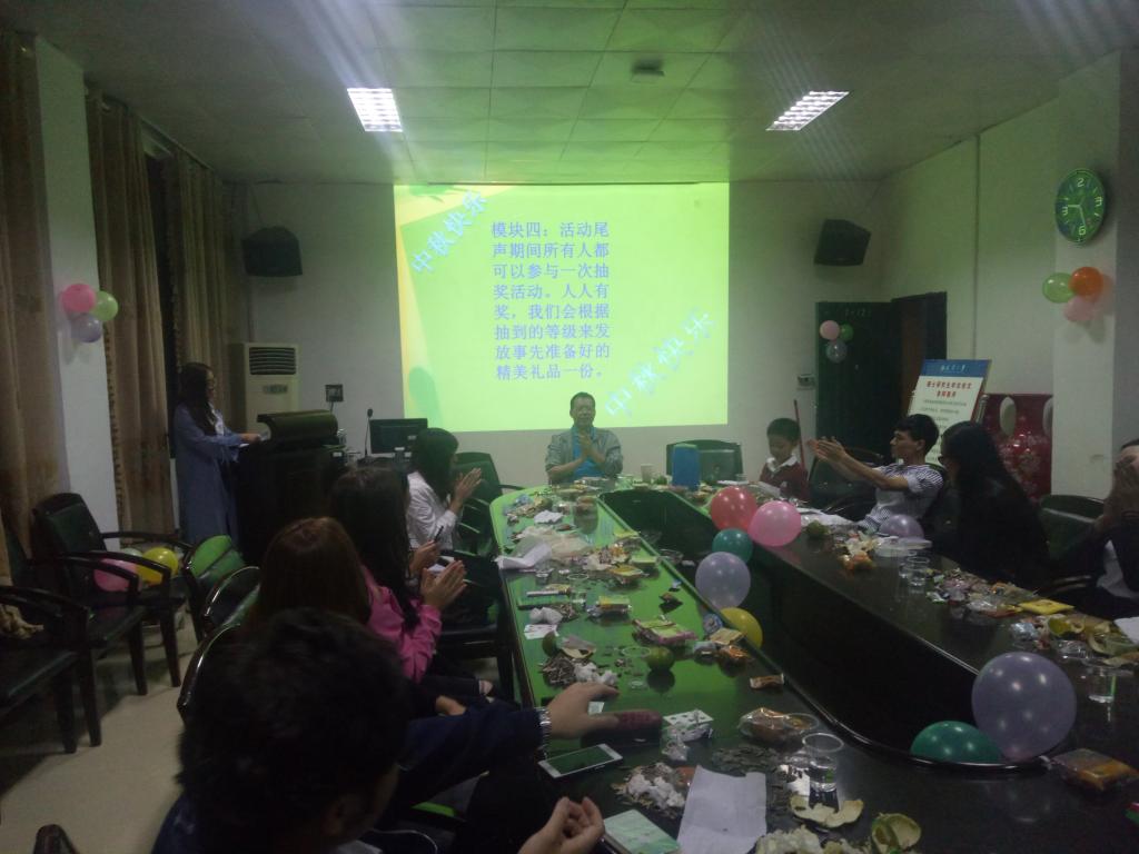 本次活动分为四个环节,第一环节由辅导员老师伍卫国讲话,宣布活动开始。接下来则是自由活动时间,期间大家可以任意吃玩,与身边的朋友喝茶聊天。在这个过程中,大家自告奉勇或者积极推荐参与人员,讲诉自己在中秋节度过的,发生的,感悟的,或难忘、或开心、或有意义的故事。第三个环节就是游戏时间,由主持人宣布游戏规则,全员参与。最后一项是抽奖环节,根据具体情况而发放最后获得的奖品。