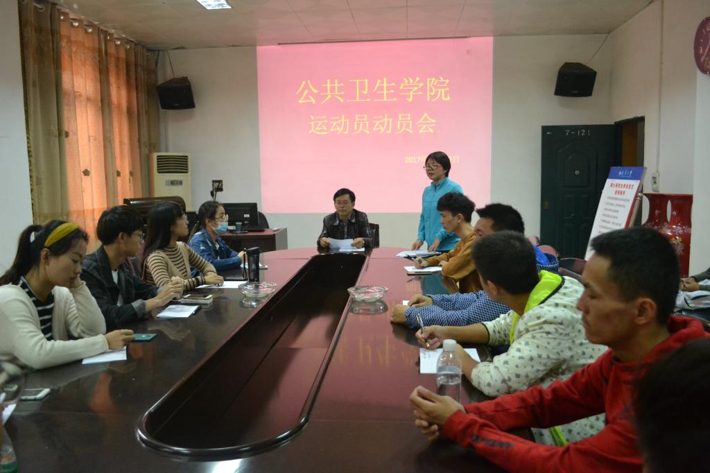为鼓励我院运动员赛出佳绩,展现公卫精神,best365英国在线体育体育部特于10月12日中午12点30,在红湘校区七教会议室召开运动员动员大会。特邀嘉宾有党委副书记田生军,学工办主任伍卫国,辅导员老师蒋剑红。出席会议的有本次运动会全体运动员和体育部全体干事。