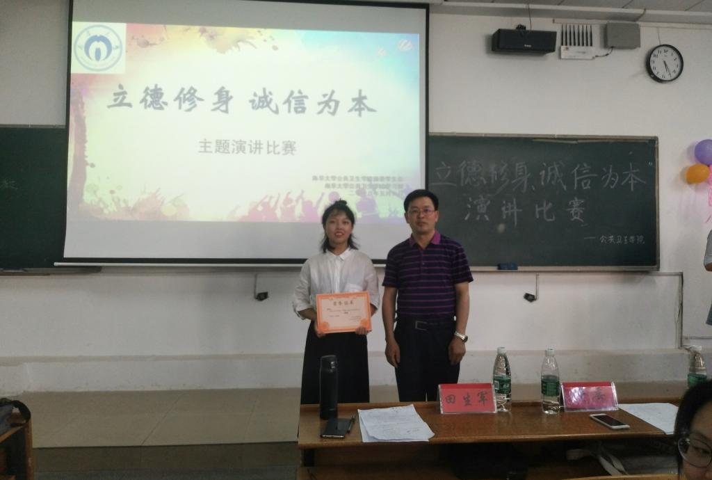 5月6日下午, best365英国在线体育“立德修身,诚信为本”主题演讲比赛于南华大学红湘校区一教112成功举办,出席本次演讲比赛的有党委副书记田生军,校学习部部长卢宇辉,院学习部部长胡静,副部长向煜。观众为部分16,17级学生。