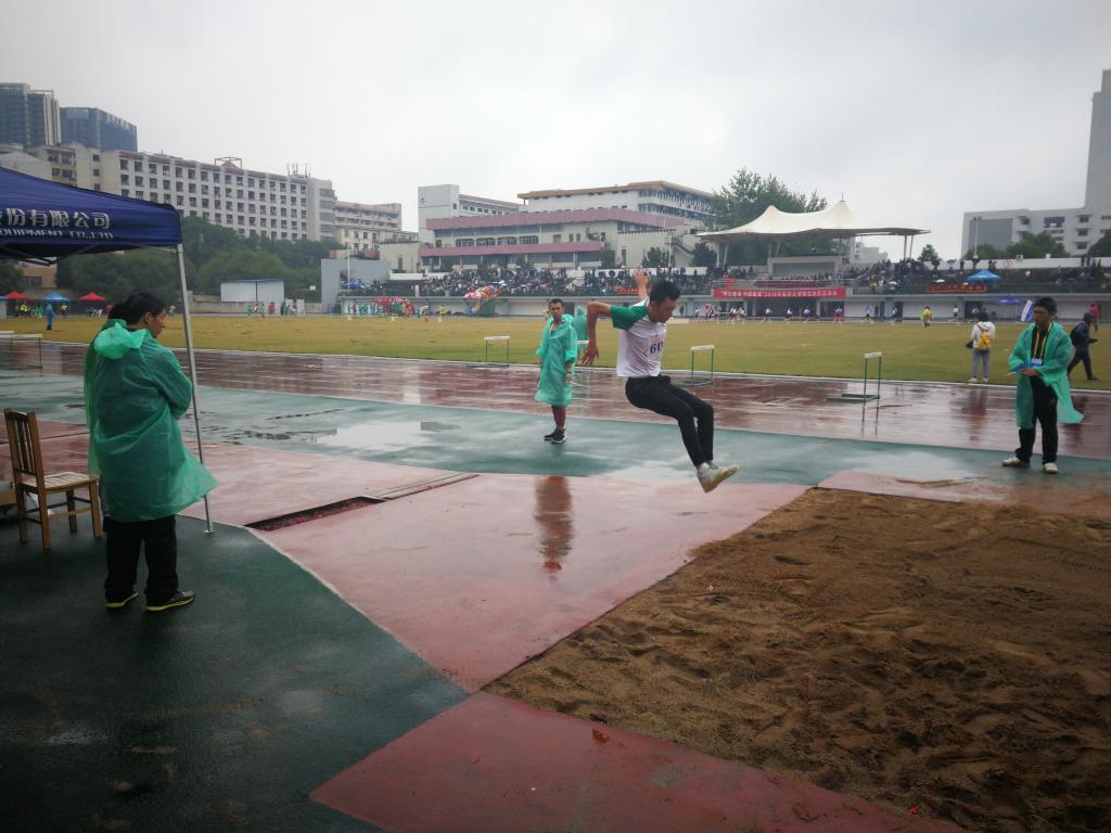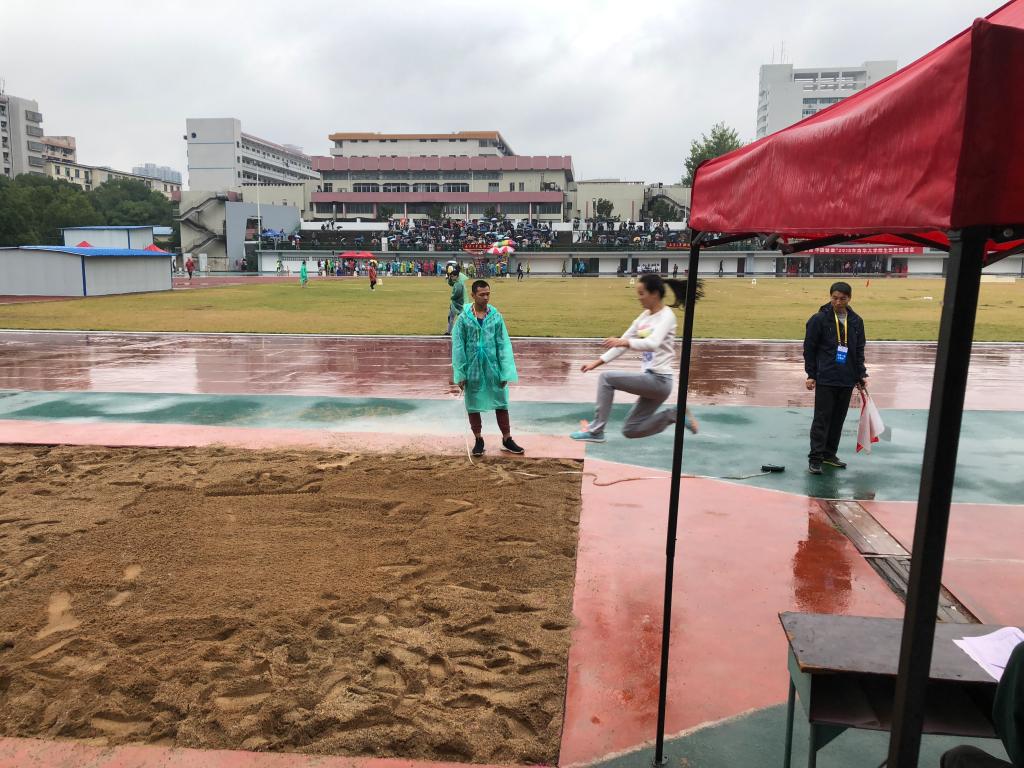 比赛一开始,公卫的擂鼓声震耳欲聋,公卫的加油呐喊声更是响彻云霄,运动员一定接收到了来自公卫的这份热情,他们不畏艰苦环境,全力向观众展现出自己最出色的训练成绩。随着两百米预决赛、跳远预决赛等比赛激烈进行后约一小时,突然,天空下起了滂沱大雨,但比赛依旧进行,运动员淋着雨坚持着,观众们也是撑着伞为其加油。