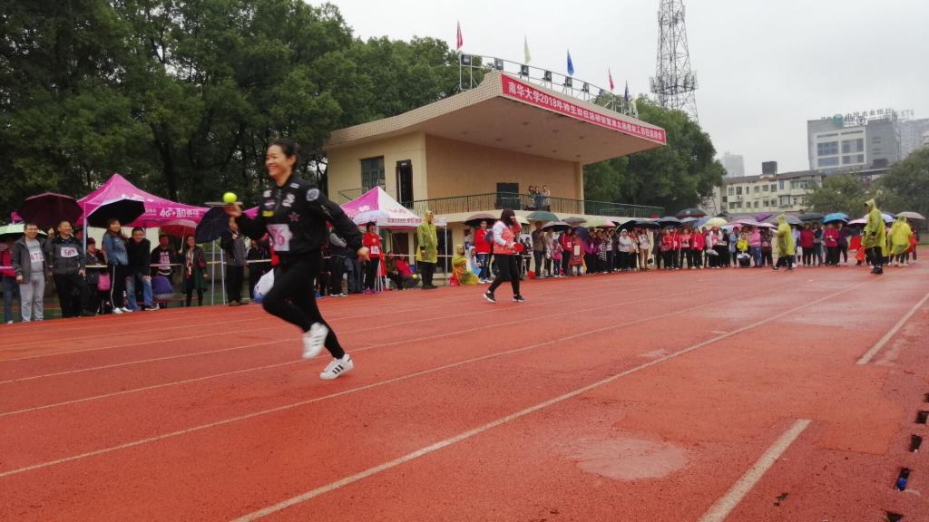 南华大学第五届教职工田径运动会第二个比赛日于10月21日上午在南华大学红湘校区南校体育场进行。我院参赛团队一共由18名老师组成,学院副院长杨慧仙,副院长李乐,院办主任陈代娣以及学工办主任孙越龙都参加了此次运动会。今天除了有大家熟知的1000米,800米,跳远等常规项目外,还有具有趣味性的托球跑步,滚铁环等。