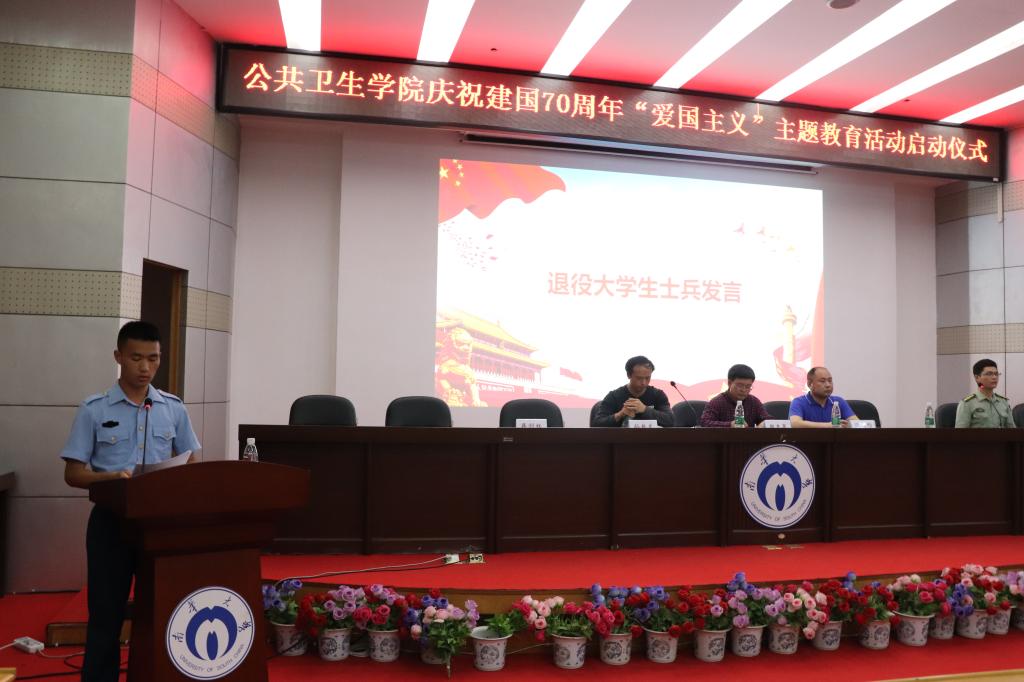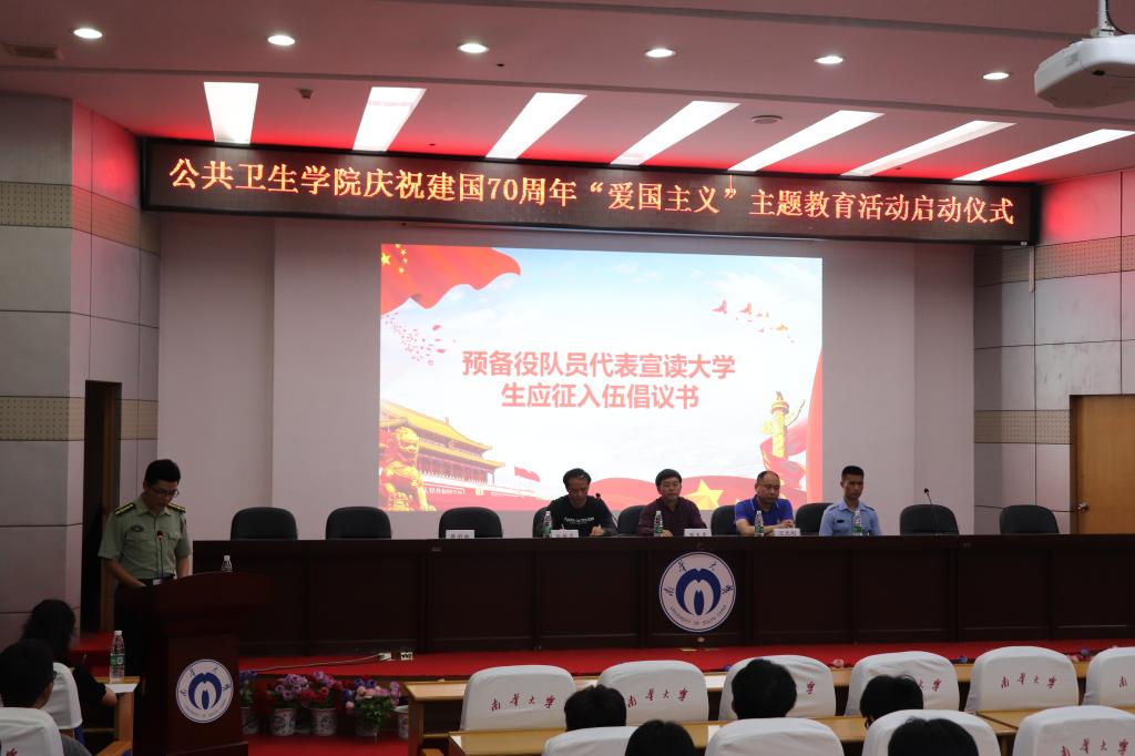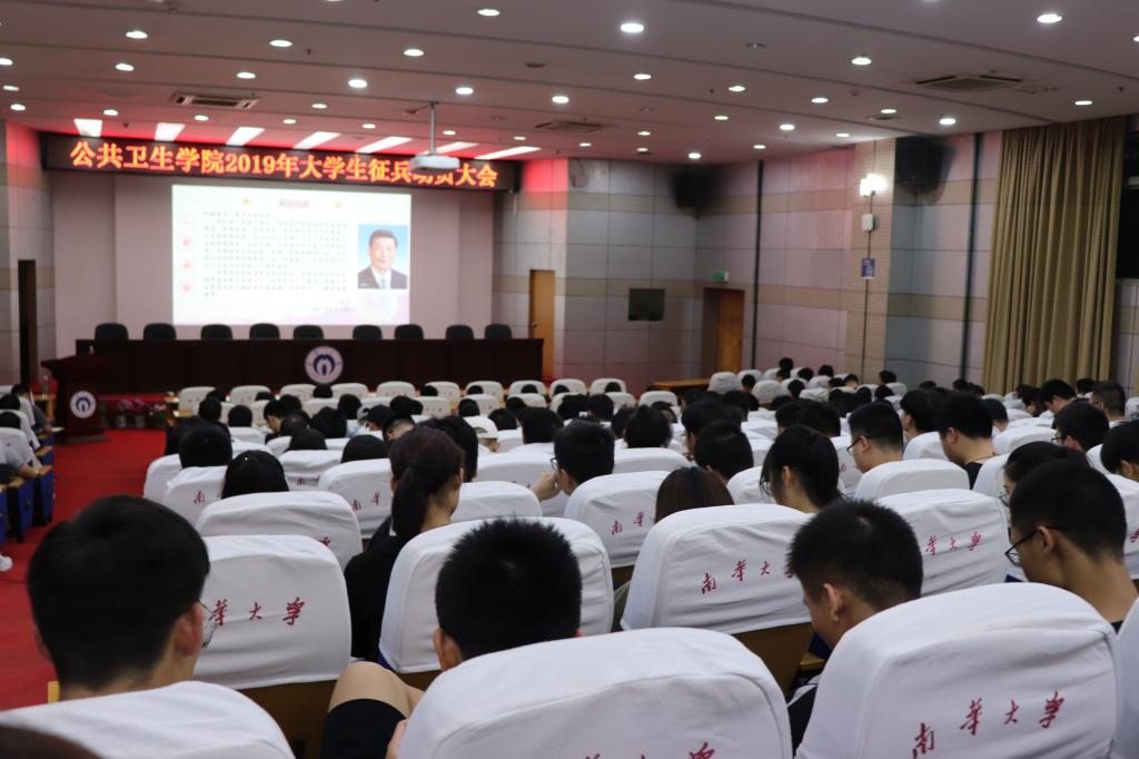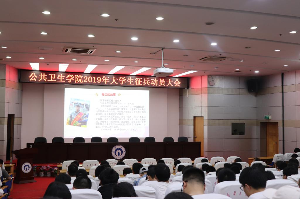 5月12日晚,由best365英国在线体育举办的“爱国主义”主题教育活动启动仪式暨2019年大学生应征入伍动员大会在南华大学红湘校区图书馆学术报告厅举行。校武装部汪先利老师、院党委副书记田生军、院院团委书记蒋剑红出席本次活动,特邀优秀退役大学生士兵宋常贵、前预备役队员樊克宇,活动由学工办主任孙越龙主持,14-18级全体男生、团委学生会干部及各班代表参加活动。