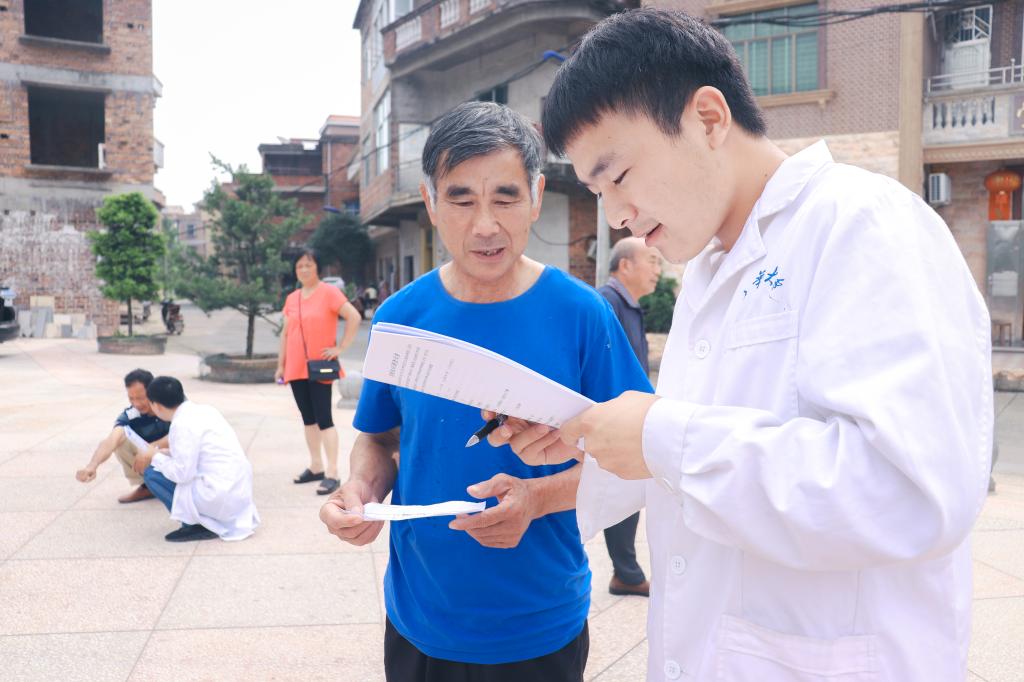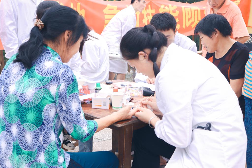 吃完早餐,队员们在村活动广场摆点等候,他们为村民们免费量血压、测血糖。这对村民来说是难得的机会,很快摆点处围满了老人,向摆点工作人员咨询后他们主动排好队等待测量。测量过程中村民对自己的健康状况很关注,“医生,医生,我的血压是不是有点高呀”,“医生,医生,血压这么高该怎么防治呢?”慢慢的,口口相传,前来问诊的人越来越多。三下乡小组成员竭尽全力用所学知识为村民们提供便利。