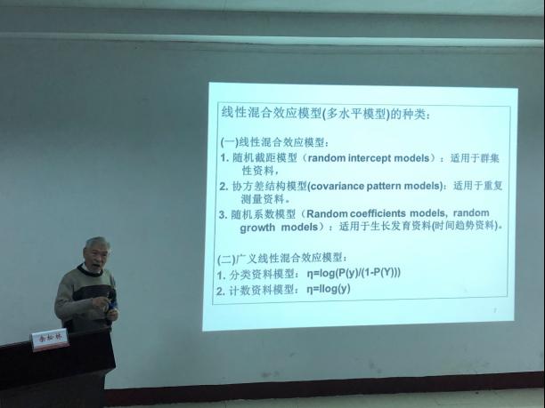 余松林教授首先做了题为《线性混合效应模型》的讲座。余教授语言简洁精练,从线性混合效应模型的概念和分类出发,讲述了混合效应模型的结构特点,随后结合案例详细阐述该模型在实际中的应用,最后小结了混合效应模型的优势和用法。余教授近87高龄仍能坚持为我们讲授知识,他对科研的执著与热情无不让我们动容,他的这种精神是我们未来科研道路上的指路明灯。