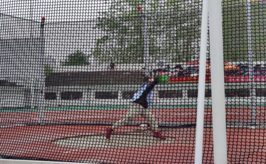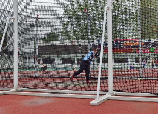 我院上午在田赛赛场上的比赛,是男子组铁饼预决赛。邹春苗和黄涛两名同学,在平日努力训练,刻苦奋斗,为的就是这一刻的荣光。他们铭记标准动作,使劲儿掷出铁饼,铁饼在空中划出一道完美的弧线,远远地飞出。