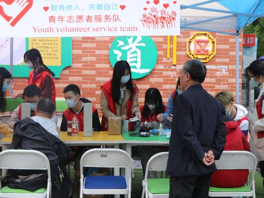 活动伊始,志愿者们身着“红马甲”,准备好物资,有条不紊地进入社区对应的站点开展一系列准备工作:搭棚、整理桌面、泡养生茶等。他们热情洋溢,待有意向者前来。