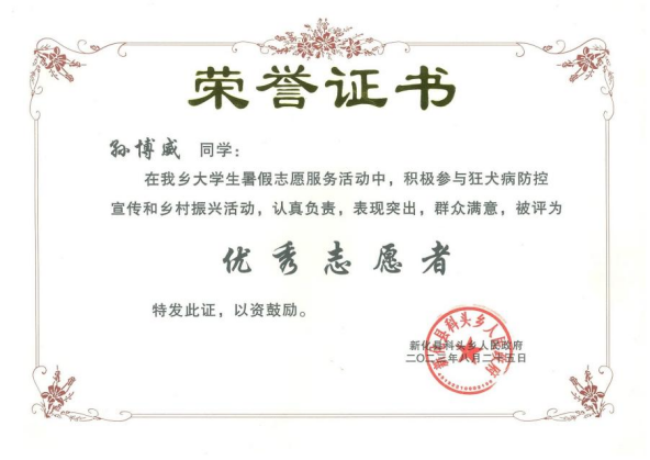 志愿者活动是广大大学生充实人生的有益探索。暑假来临之时,孙博威就想着自己祖辈出生于农村,一定利用难得的时机,回家乡参加一些志愿活动,帮助家乡做点实事。他利用科头乡组织大学生志愿者助力疫情防控和乡村振兴机会,参加了志愿者服务活动。参加志愿者后,他利用近一个月的时间,结合自己所学的知识,参加了科头乡组织的狂犬病预防宣传活动。他跟乡政府组织的宣传队伍一起,深入到了每一个村落和屋场进行宣讲。同时,利用农村赶集时间,共发放宣传册2000多份,对消除和纠正农村土法治疗狂犬病,怎么科学预防和治疗狂犬病起到了很好的宣传作用,也得到乡政府和广大群众的满意和认可。