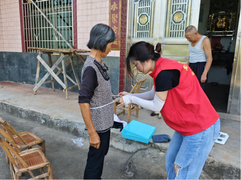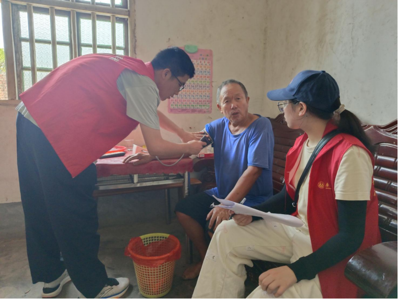 “爷爷,您血压有点偏高,平时做饭一定要少放盐,饮食尽量清淡些。”在村民单爷爷家中,走访队员手持便携式血压计,一边仔细测量,一边耐心地向老人叮嘱日常注意事项。活动期间,各组队员携带血压计、卷尺等专业工具,逐家逐户上门服务。在为村民进行基础健康检查的过程中,队员们发现马脑寨村部分患有高血压的老人家中竟未配备血压计,这一情况折射出乡村健康管理的薄弱环节,也为后续精准开展健康帮扶指明了方向。
