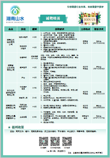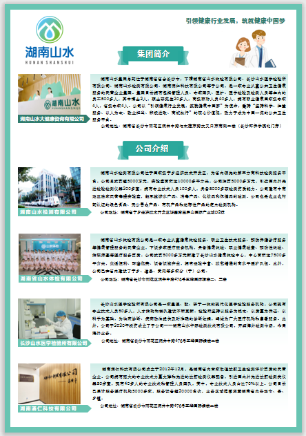 湖南山水集团总部位于湖南省省会长沙市,下辖湖南省山水体检有限公司、长沙山水医学检验所有限公司、湖南山水检测有限公司、湖南涌仁科技有限公司等子公司,是一家专业从事公共卫生健康服务的民营企业集团。(招聘信息具体见附件)