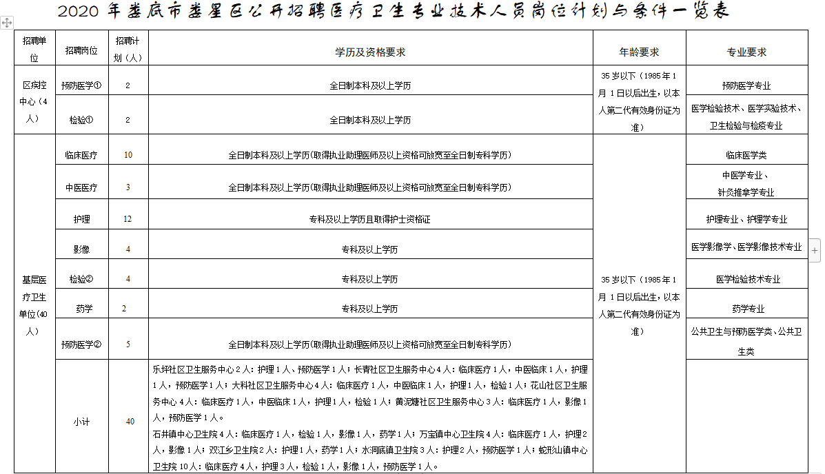 本次共招聘医疗卫生专业技术人员44名,其中区疾控中心4名,基层医疗卫生单位40名。