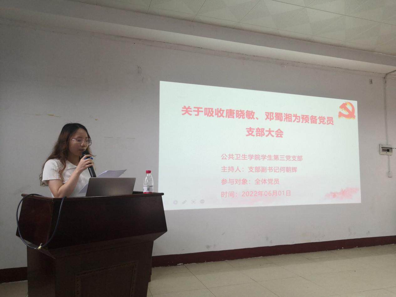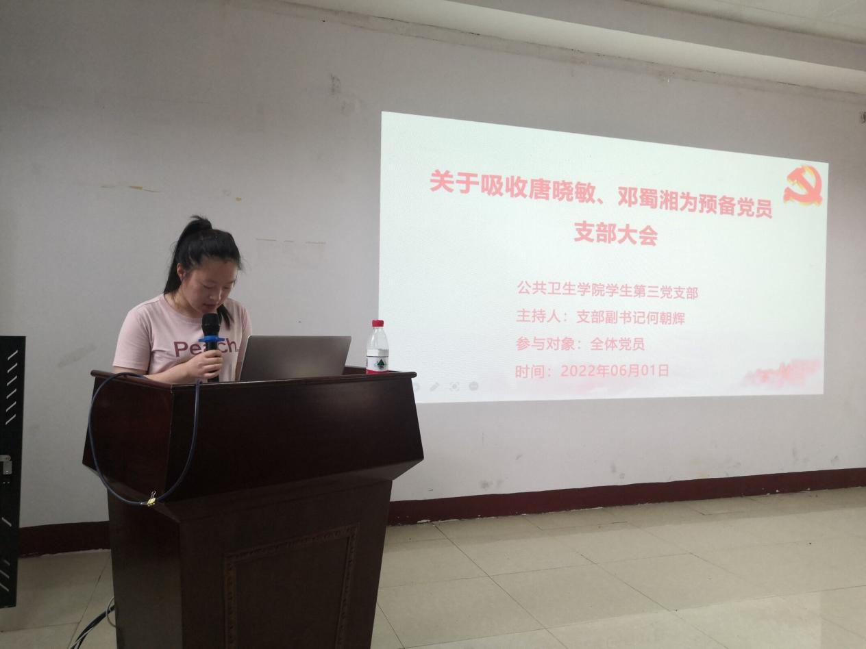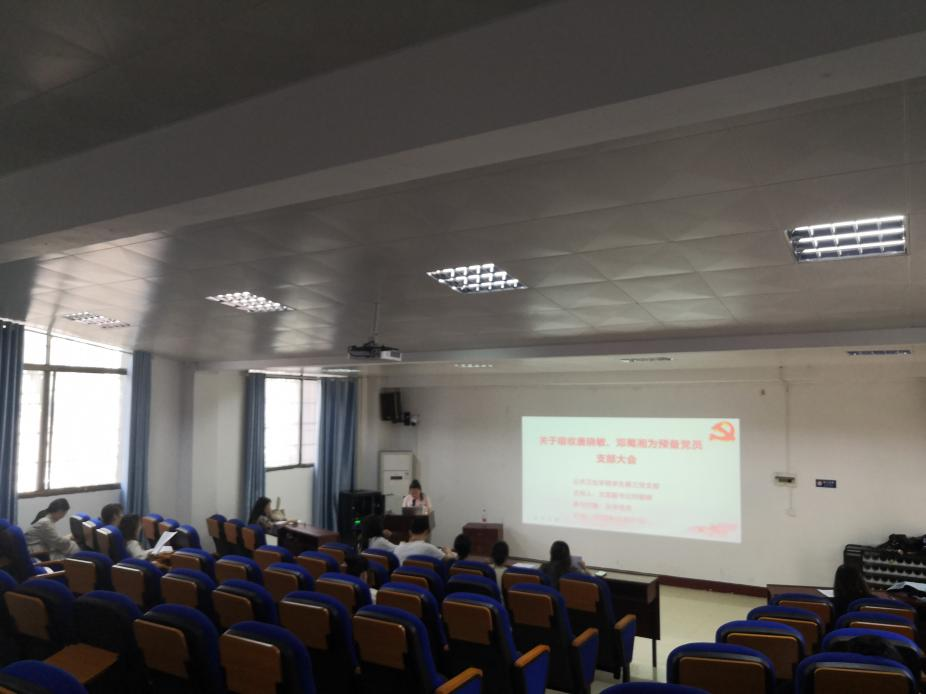会议第一项议程,讨论接收预备党员事项。首先两名发展对象向党组织做汇报:唐晓敏、邓蜀湘两名同志从生活、工作以及入党动机等方面分别总结了自己的个人情况,表达自身对党组织靠拢强烈愿望,并表示如果加入中国共产党,一定更加严格要求自己,成为一名合格的共产党员。