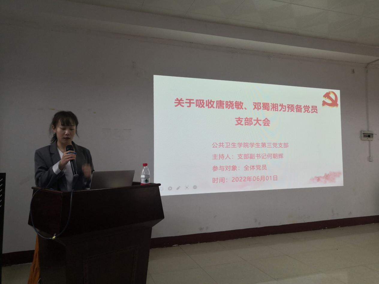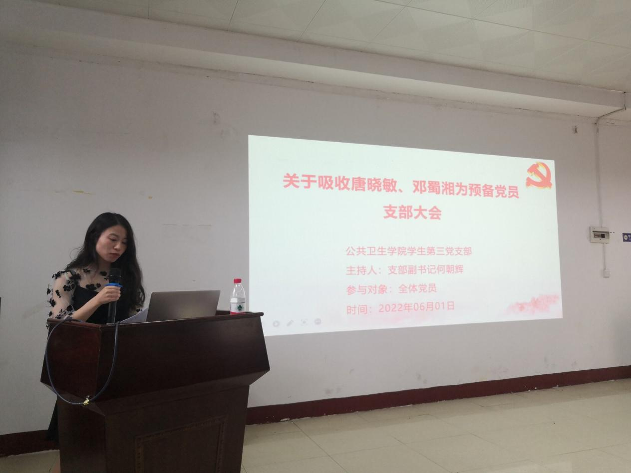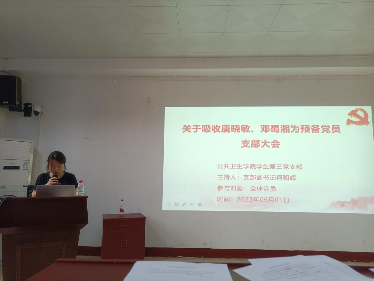 会议第一项议程,讨论接收预备党员事项。首先两名发展对象向党组织做汇报:唐晓敏、邓蜀湘两名同志从生活、工作以及入党动机等方面分别总结了自己的个人情况,表达自身对党组织靠拢强烈愿望,并表示如果加入中国共产党,一定更加严格要求自己,成为一名合格的共产党员。