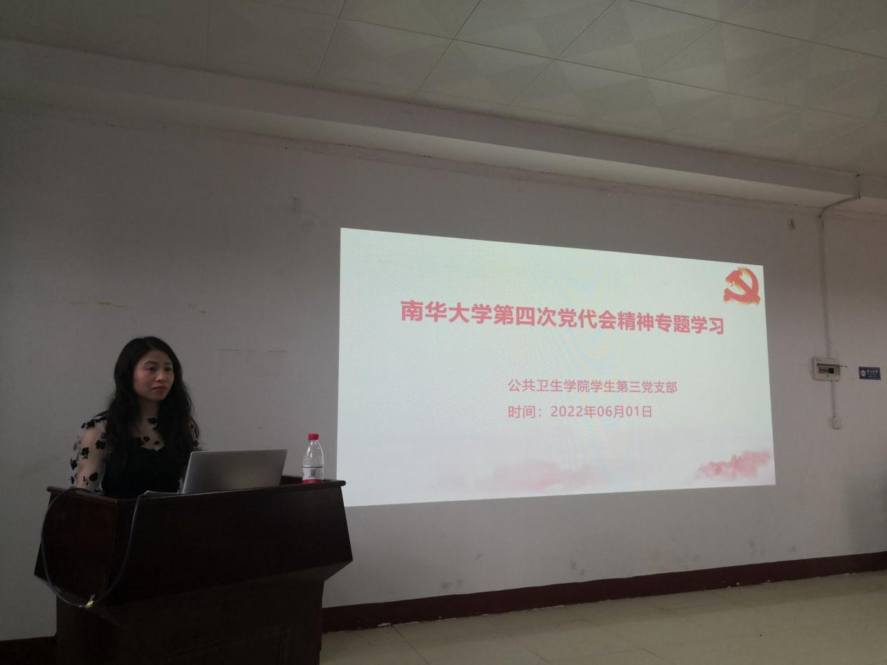 会议进入第二部分,由何朝辉带领全体党员进行南华大学第四次党代会精神专题学习。全体党员同志深刻了解了第四次党代会精神的内涵及要求,努力用实际行动去践行相关精神。