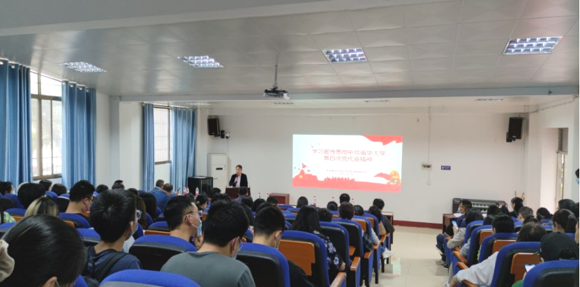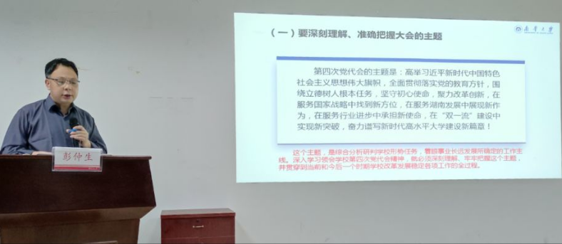 首先,由学校宣讲团成员、校纪委副书记彭仲生宣讲第四次党代会精神。彭仲生用生动的文字、图片从第四次党代会概况、第四次党代会报告产生过程和框架结构、深刻领会和准确把握第四次党代会的精神实质(5个深刻领会和准确把握)和全面抓好第四次党代会精神的落地落实等四个大的方面向大家进行了党代会精神的宣讲和详细解读,内容全面,站位很高,精准细致,深入浅出、给人启迪和奋进。彭仲生表示,未来五年,是学校建设新时代高水平大学的关键五年。朝着跻身国家“双一流”高校行列的目标,我们要更加紧密地团结在以习近平同志为核心的党中央周围,坚守初心使命,聚力改革创新,在“双一流”大学的赛道上奋力奔跑,跑出属于我们南华人的精彩未来! 彭仲生强调要把全体党员干部和广大师生员工的思想统一到大会精神上来,把各方面的智慧力量凝聚到实现奋斗目标上来,以更加坚定的信心、更加昂扬的斗志、更加务实的作风,奋力开创新时代高水平大学建设新局面,具有重要意义。